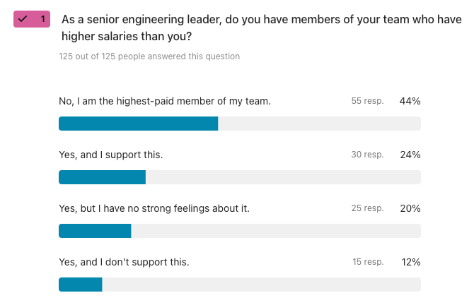 Last week we ran a quick poll about the disparity between technology leader salaries and those of their team members. Unsurprisingly, the largest cohort in the results were the highest paid in their teams, but that cohort only made up 45% of the total responses. Here's the full result: