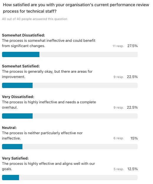 The results of last week's survey about performance reviews was fairly eye-opening - as you'll see below, 65% of all respondents were neutral or dissatisfied with their current approaches. We'd love to know more - what's not working, and what are the negative effects you're experiencing from the current process? Drop us a reply đ