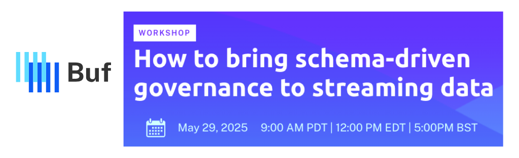Join our interactive workshop on May 29: "Schema-Driven Governance for Streaming Data" for a deep dive into the technical underpinnings of Bufstream and the capabilities that become available when you understand the shape of your streaming data.