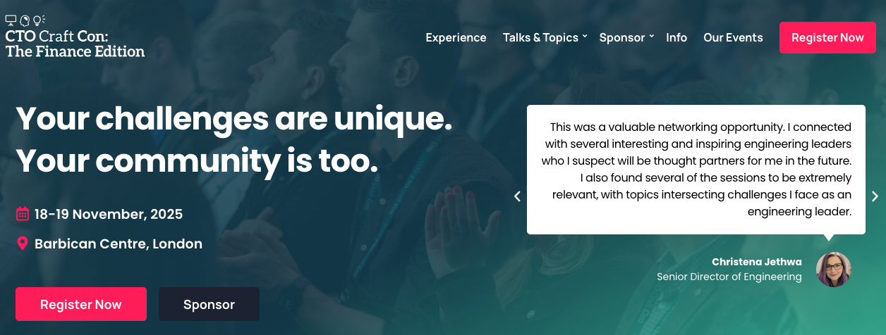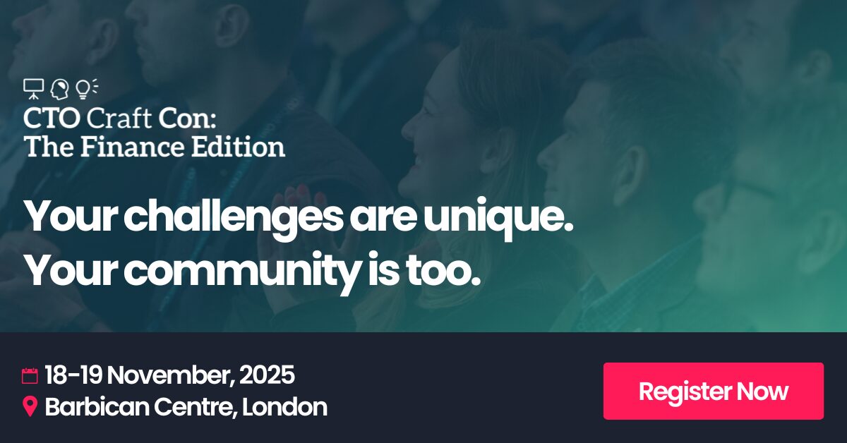 To help you cut through the noise, track emerging trends, and share what other technology leaders are doing to stay ahead, we're running a special CTO Craft Con just for technology leaders in the fintech and financial services space. It'll take place in London in November, and it's going to be the best gathering of technology minds in the industry. Secure your ticket below - see you there!